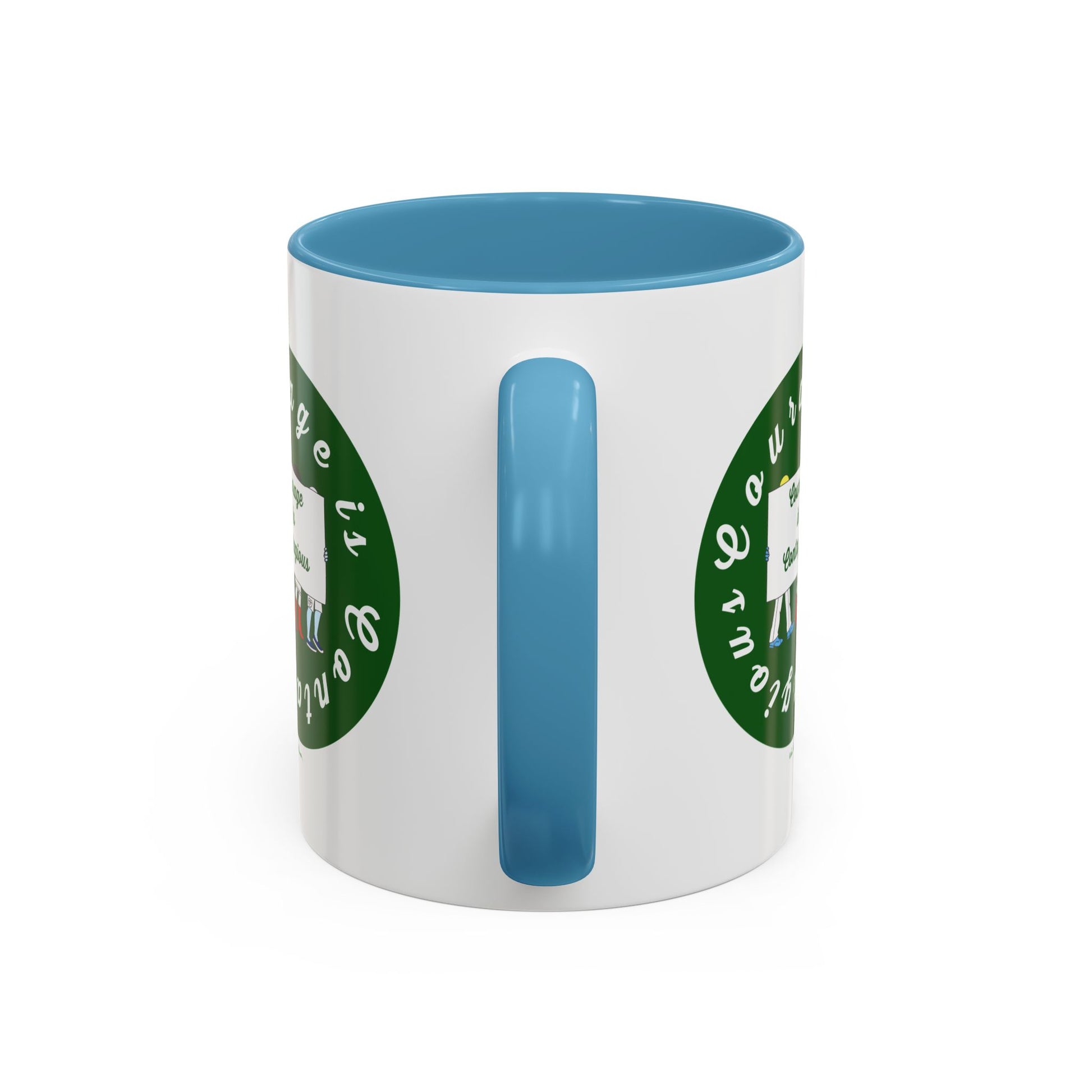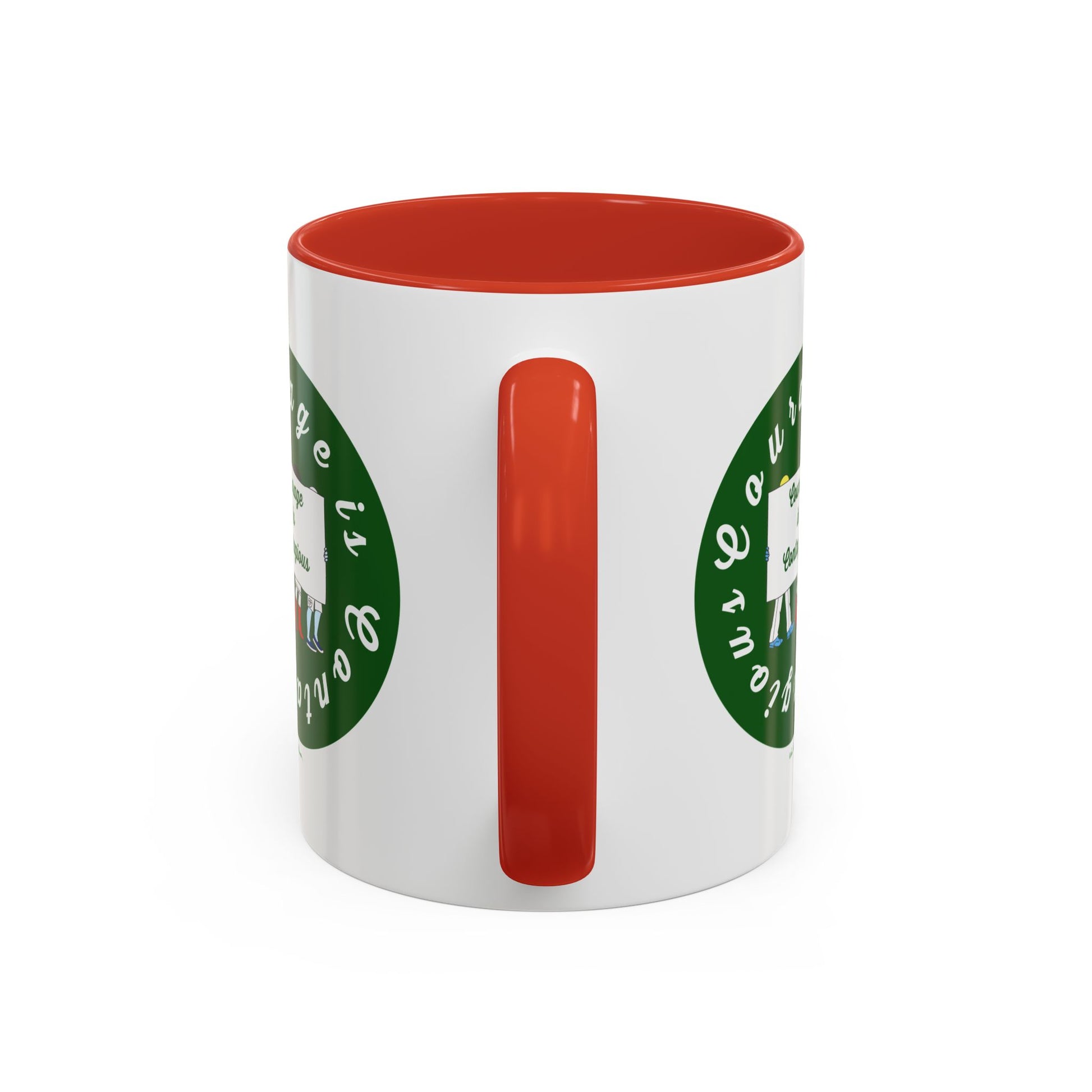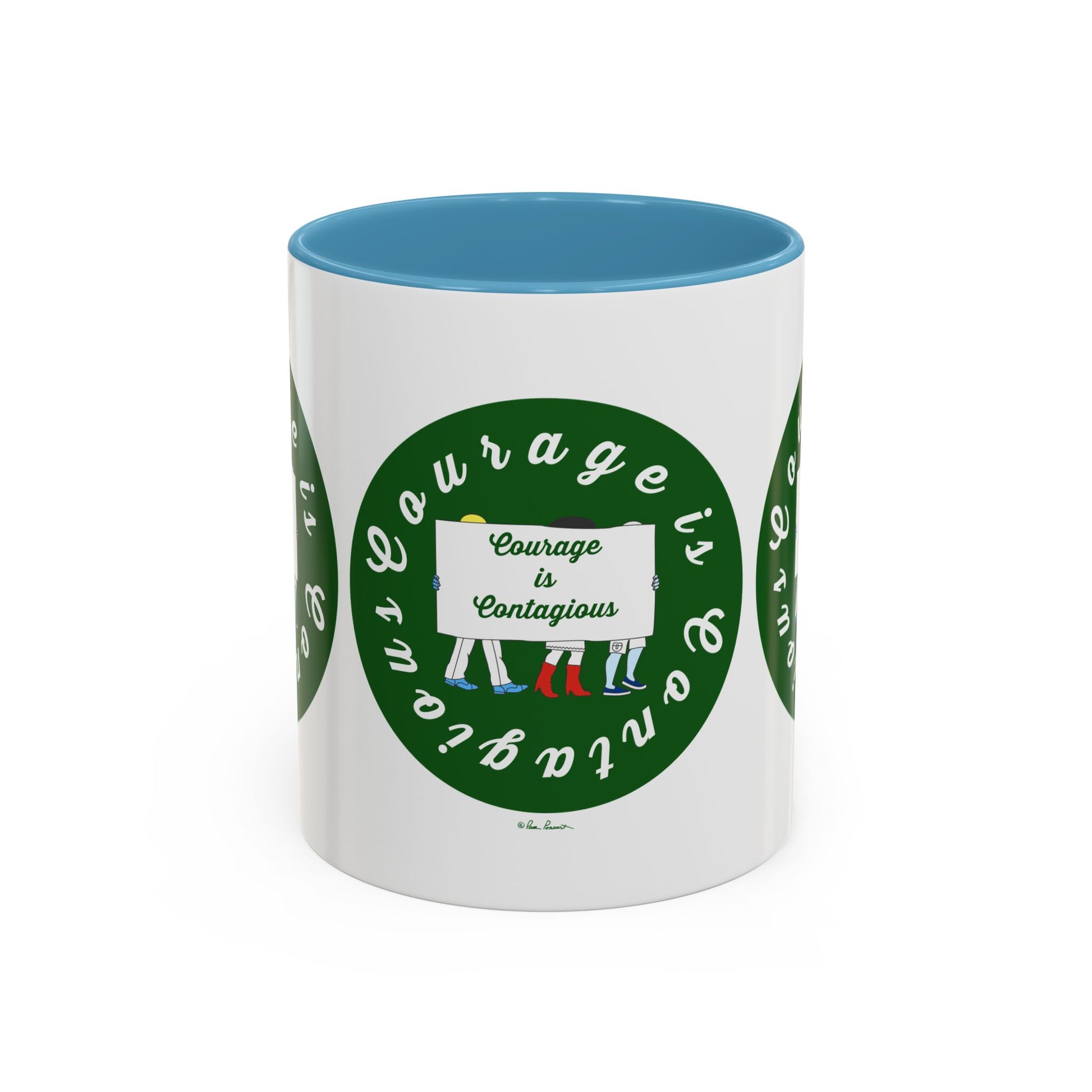 Our Courage Is Contagious Coffee-Mug features a cheerful color-contrast that brings a warm message to every morning. The glossy white exterior frames a bold green circular design that reads "Courage is Contagious" around a small sign held by three stylized figures. A vibrant colored interior and matching C-handle add a playful pop—shown here with a festive red—so the mug stands out on the counter or at your desk. Durable, easy to care for, and lead/BPA-free, it holds 11 oz of your favorite drink and keeps that encouraging phrase in view with every sip. This Courage Is Contagious Coffee-Mug makes a great gift for any occasion and it ships free within the continental USA.